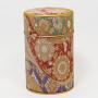 Japonská kovová dóza s dvojitým uzávěrem a dekorativním papírovým povrchem. |